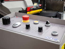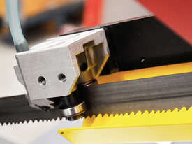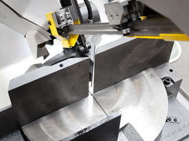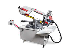 Bomar Ergonomic 320.258DG is a manual lift with control cut band saw with a heavy saw frame of vibration-proof cast alloy, with a powerful industrial engine and a spiral gearing running in an oil bath, Precise hard metal saw band guides, saw head pivot embedded in pre-stressed conical bearings, a 27mm saw band and a synchronic swarf brush are the prerequisites for excellent cutting performance. The front-handled, very simple and fast angle adjustment for cuts in the range of -45° to + 60° and a quick-acting vice clamping provide for a broad application range. The machine is equipped with a large rotary table providing a good basis also for short pieces. The frame lifting is manual and the cutting feed can be adjusted on the control panel. A coolant equipment in the machine base, a big extractable swarf container with a dripping sieve (ecological disposal of dry swarf) LaserLiner, Variable speed motor in the range 20m/min-120m/min belong to the standard equipment. A broad range of accessories and options as roller conveyors and stops, minimum-amount lubrication system, smooth variable speed regulation is available for this machine as options.