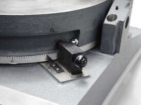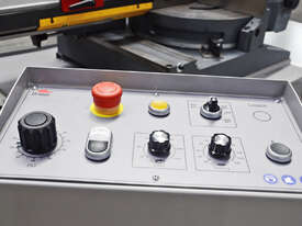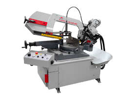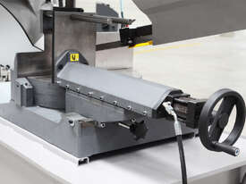 Precise hard metal saw band guides, saw head pivot embedded in pre-stressed conical bearings, a 27mm saw band and a syn-chronic swarf brush are the prerequisites for excellent cutting performance. The front-handled, very simple and fast angle adjustment for cuts in the range of -45° to +60° and a quick-acting vice with hydraulic clamping provide for a broad application range. The machine is equipped with a big feed table providing a good basis also for short pieces. The frame lifting and the cutting feed have hydraulic drive. The cutting feed can be adjusted on the control panel. The machine is equipped with an automatic cutting pressure regulation system. A coolant equipment in the machine base, a big ex-tractable swarf container with a dripping sieve (ecological disposal of dry swarf) Laser Liner, Variable Speed motor belongs to the standard equipment.